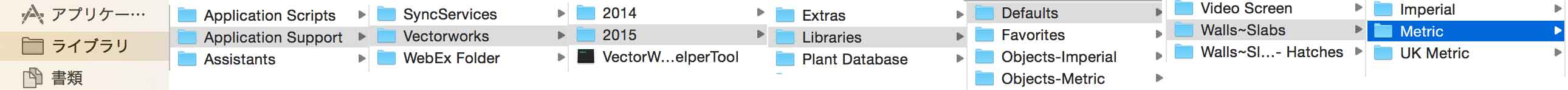 VW2015になってやっとこ日本仕様になりました。 カーテンウォールなる物が追加されております。 大元は にあります。表示させたく無い場合はそこから削除するか、「E_Metric」フォルダなと 別の場所に移すといいです。 オリジナルの壁スタイルを表示させたい場合は、先ほどの同じ階層にファイルを置くか(ファイル名はなんでもOK)、アップデートのたびに入れ直すのがいやな場合は、 ユーザーのライブラリの中に入れる(Macの場合) (Yosemiteの場合 標準では表示されない(非表示になってる)ので、ネットで調べて下さい。)