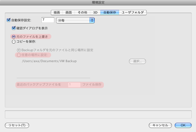 1 2 3 4 5 6 Ver12.5からの変更点 1.描画 4.3D はそのまま 5.自動保存が独立タブになり、バックアップの場所を指定できるようになりました。5.ユーザフォルダが追加になり、プレファランスフォルダを指定できるようになった。