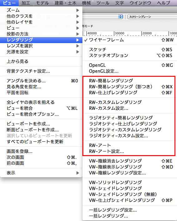RenderWorksをインストールすることで 赤枠のメニューが追加される。 表示されないときは、 メニュー>ツール>作業画面 で +R を選択する。