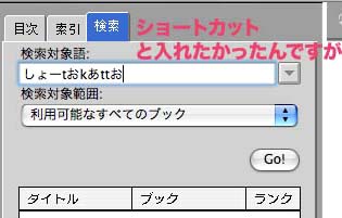 - うちのVW12をMac OS 10.3.9上では『ショートカット』と入力可能。画面にはちゃんと検索結果が出て来ました。確かに、対応OSは10.3.9〜10.4.4でしたね。 -- *nora