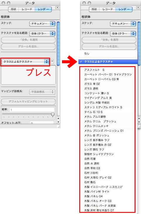 左の『クラスによるテクスチャ』 をプレスすると 右のような素材がでてきます。