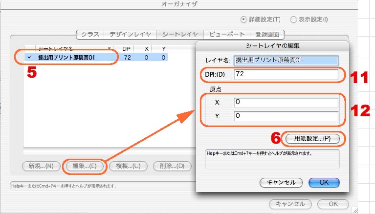11.  【シートレイヤの編集】ウィンドウに戻るので、〈DPI:〉の覧をプリンタの解像度に合せた値に修正します。