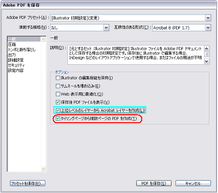 オプションの互換性のある形式からAcrobat6か7を選択、「上位レベルのレイヤーからAcrobatレイヤーを作成」と