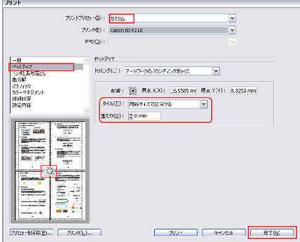 ファイルからプリンターを選び、セットアップ項目で「用紙サイズで区分ける」「プリント可能範囲で区分ける」のいずれかを選択、
