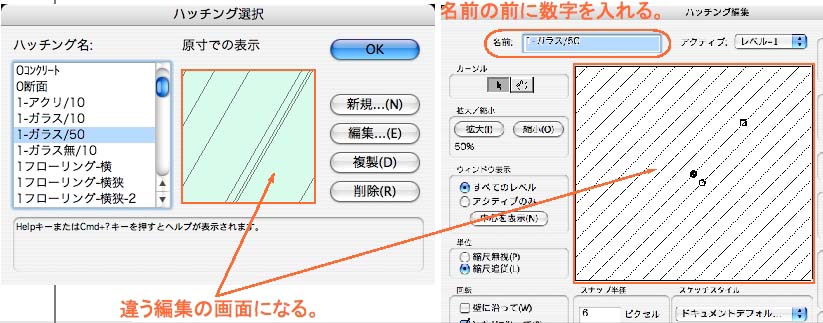 - 原寸画面と編集画面のプレビューが異なる。選んだのと違うハッチングの編集になってしまう。