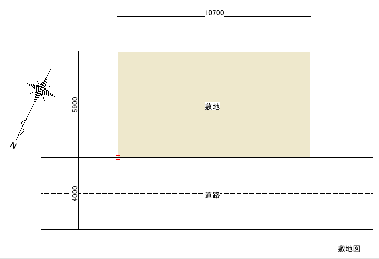 平面に 敷地、道路、磁北を記入